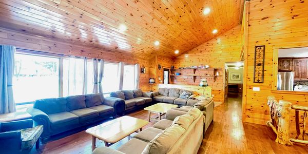An Open Concept Kitchen will serve all your meal prep needs with a Full sized Refrigerator, Gas-Range/Double oven, convection microwave, and dishwasher. The expansive dining area has two oversized tables that easily seat 20 people. The Spacious yet cozy living room has stunning knotty pine vaulted ceilings that compliment the beautiful floor to ceiling Stone wood burning Fireplace. A convenient first floor Laundry room is available for guests use.